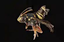 Nomada texana males measure from 7.5 to 8.0 mm,[1] and females measure at around 8–9 mm. These bees are primarily black with yellow markings and reddish legs.[1]