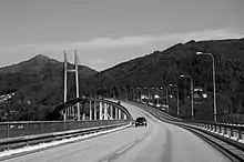 The Nordhordland Bridge (Norwegian: Nordhordlandsbrua) is a combined cable-stayed and pontoon bridge which crosses Salhusfjorden between Klauvaneset (in Bergen Municipality) and the island of Flatøy (in Alver Municipality) in Vestland county, Norway. It is 1,614 meters (5,295 ft) long, of which the pontoon section is 1,246 meters (4,088 ft) long. The cable-stayed section consists of a single 99-meter (325 ft) tall H-pylon which has a length of 368 meters (1,207 ft) and a main span of 172 meters (564 ft). This allows for a clearance of 32 meters (105 ft).