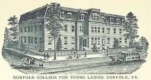 The college was chartered on Feb. 20, 1880 and opened with 125 students. John L. Roper was president of the college's board.[1] The school was founded to reduce the flow of young women leaving Norfolk for their education.[2] It was located at the northwest corner of Granby and Washington Streets; in 1887 Washington Street was renamed "College Place".[3] In 1899, Mary Washington College took over the building for a few years.[4][5]