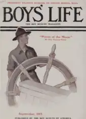 After that, Rockwell was hired as a staff artist for "Boys Life". In this role, he received 50 dollars' compensation each month for one completed cover and a set of story illustrations. It is said to have been his first paying job as an artist.[28] At 19, he became the art editor for Boys' Life, published by the Boy Scouts of America. He held the job for three years,[29] during which he painted several covers, beginning with his first published magazine cover, Scout at Ship's Wheel, which appeared on the Boys' Life September 1913 edition.