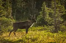 The most characteristic animal for these forests is the mountain caribou (Rangifer tarandus), also referred to as woodland caribou, which is currently listed as an endangered species by the U.S. Fish and Wildlife Service.[25] The reasons for this endangerment are complex: Mountain caribous relies heavily on oceanic hair lichen as main food source during the winter, when ground vegetation is out of reach due to the immense accumulation of snow (2-5m) in the mountainous regions. Because of an increase in logging, the old-growth habitat for these lichen species are diminishing. Another problem is the increasing temperatures: due to a shift towards warmer climate conditions, the inland rainforest patches became successional habitat for moose (Alces alces), deer (Odocoileus) and elk (Cervus elaphus), which led to an increase in predatory species. While the mountain caribou is safe during the winter season due to the altitude that it dwells on, it is highly vulnerable in the summer months, when moose and deer move to higher elevations and attract predators that also prey on the caribous.[26]