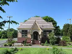 The crossroads at the center of North Amherst took shape in the mid-18th century, when the area was still part of Hadley. The area had been surveyed in 1739, with land divisions for farming resulting in its creation. A grist mill was located on the Mill River a short way north of the center. By the early 19th century there was a small cluster of buildings around the junction, and by 1833 there were a church, school, and tavern, as well as parsonage and doctor's residence. The area remained predominantly agricultural; small-scale industrial activity took place on the river, but did not last. The most significant late addition to the village streetscape was the 1893 Romanesque library.[2]
