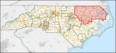 On February 23, 2022, the North Carolina Supreme Court approved a new map which changed the 1st district boundaries to add Chowan, Franklin, Greene, Pasquotank, Perquimans, Tyrrell and the remainder of Vance County while removing Wayne County.[5]