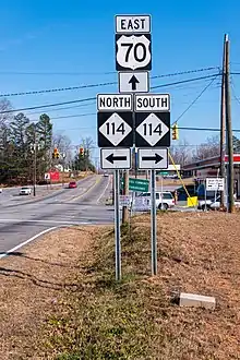 NC 114 was established between 1929 and 1930 by the North Carolina State Highway Commission.[2][3] It first appeared on official North Carolina state highway maps in 1930.[3] At the time of establishment, its southern terminus was located at an intersection with US 70 and NC 10 south of Drexel. It travelled north along its modern-day routing, ending at Oakland Avenue in Drexel. NC 114 was a hard surface paved road beginning at the time of establishment.[8] US 64 was extended east from Chattanooga, Tennessee along US 70 by 1933.[9][10][11] By 1935, NC 10 was truncated to NC 73 (modern day NC 16) in Newton, ending the concurrency with US 64 and US 70 and its connection with NC 114.[12][13] NC 114 was extended south along Drexel Road to its current southern terminus at I-40 in 1976.[14] In 1988, US 64 was re-routed between Morganton and Statesville to follow NC 18 and NC 90.[15] Since being extended south to I-40, the road's designation has not been changed.[5]