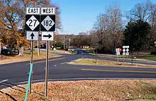 NC 182 is a two-lane rural highway that begins at NC 226 in Polkville and ends at NC 27 near Lincolnton. The 23.3-mile (37.5 km) route is a mildly curvy road crossing the First Broad River in Lawndale.[1] All of NC 182 is concurrent with North Carolina Bicycle Route 8.[2]