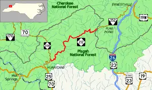 NC 212 is a 14.2-mile (22.9 km) two-lane mountain highway that begins in the community of Belva at NC 208. Traveling in a northeasterly direction, it hugs along the banks of the Shelton Laurel Creek, arriving in the community of White Rock four miles (6.4 km) into the trip. Continuing on, it travels through the heart of the Pisgah National Forest, going between Limestone and Sugarloaf Mountains. At Devil Fork Gap (3,107 ft (947 m), highest point on route), it crosses both the Appalachian Trail and the Tennessee state line, continuing on as SR 352 towards Johnson City.[1]