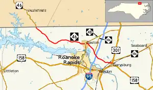 North Carolina Highway 46 (NC 46) is a primary state highway in the U.S. state of North Carolina; it is entirely in Northampton County. The route primarily connects the communities on the north side of Roanoke Rapids Lake and Lake Gaston, as well as the north side of the Roanoke River in the county.