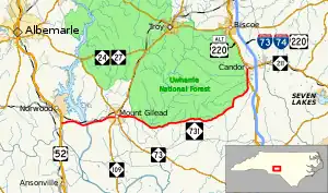 NC 731 is a two-lane rural highway that traverses 25.9 miles (41.7 km). Beginning at U.S. Route 52 (US 52) south of Norwood, it goes west crossing the Pee Dee River and through Mount Gilead. In Mount Gilead, NC 731 intersects NC 109 and NC 73 and has a concurrency with the unsigned NC 109 Business (NC 109 Bus.). Forming the southern boundary of the Uwharrie National Forest, it continues a northwesterly direction, linking up with US 220 Alternate (US 220 Alt.) as it enters Candor. At the center of Candor, NC 731 ends, connecting with NC 211 and US 220 Alt. continuing north to Biscoe.[1]