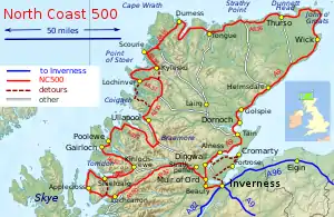 The North Coast 500 is a 516-mile (830 km) scenic route around the north coast of Scotland, starting and ending at Inverness Castle.[1] The route is also known as the NC500 and was launched in 2015, linking many features in the north Highlands of Scotland in one touring route.