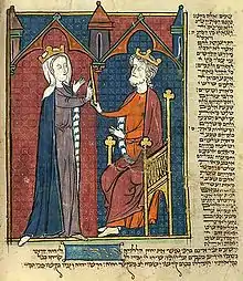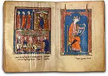The North French Hebrew Miscellany or "French Miscellany" or "London Miscellany" (British Library Add. MS 11639) is an important Hebrew illuminated manuscript from 13th-century France, created c. 1278-98.[1] A miscellany is a manuscript containing texts of different types and by different authors, and this volume contains a wide range of Hebrew language texts, mostly religious but many secular. The manuscript is exceptional among medieval Hebrew manuscripts both for its size and the diversity of the texts and the quality and lavishness of its illuminations, which as was often the case were added by Christian specialists.[2]