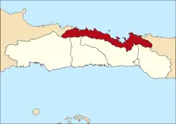North Gorontalo (Gorontalo Utara) is a regency of Gorontalo Province, Indonesia, stretching along the entire northern coast of the province. It is located on the northern peninsula of the island of Sulawesi. It was established in 2007 under Law Number (Undang-Undang Nomor) 11/2007 from the former northern districts of Gorontalo Regency. The new regency has an area of 1,777.02 km2, and it had a population of 104,133 at the 2010 Census[2] and 124,957 at the 2020 Census;[3] the official estimate as at mid 2022 was 128,563 (comprising 65,615 males and 62,948 females).[1] Its regency seat is the town of Moluo in Kwandang District.