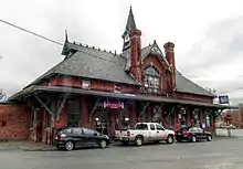 Besides the Fitchburg Line station, Leominster also once had two other train stations. The Fitchburg and Worcester Railroad opened in 1850 between the eponymous cities, with a station stop in Leominster Center as well as West Leominster (at Hamilton Avenue).[2][4] Through service from Worcester to Fitchburg ended in 1926, and the last passenger service through Leominster Center ended in 1931. The line is now used for freight service from the south but is abandoned north of Mechanic Street in downtown Leominster.[2] The 1878 Leominster Center station still stands at 24 Columbia Street.[20]