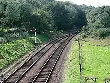 Starting from Sheringham station, the lines follows the coast westwards, soon passing over the Automatic Open Crossing at Sweetbriar Lane, where the private road leading to Sheringham Golf Club crosses the line.[36] The line climbs a 1 in 97 gradient, with the golf course, and Skelding Hill,[37] on the seaward side of trains, while the A149 can be seen on the landward side of trains, roughly paralleling the tracks with Upper Sheringham visible in the distance. During WW2, Skelding Hill was the location for an emergency coastal battery, complete with an underground headquarters bunker.[38]