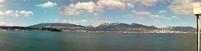 The North Shore, as seen from downtown Vancouver. To the right are the City and District of North Vancouver, and to the left is the District of West Vancouver.