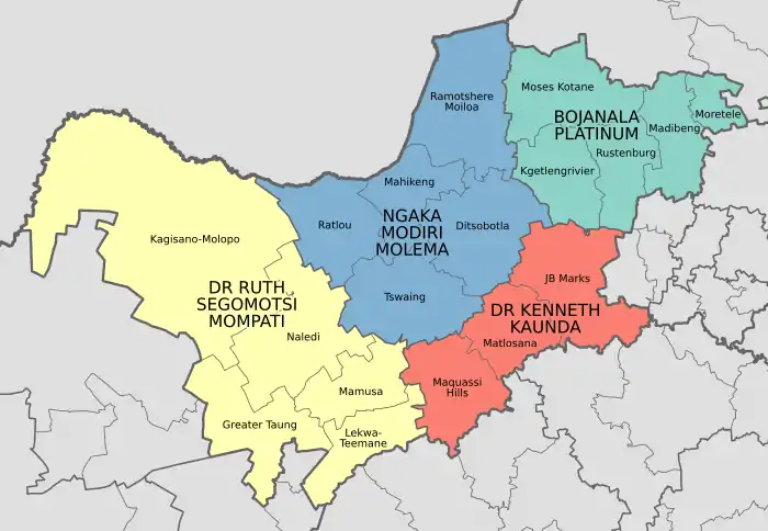 The North West Province is divided into four district municipalities. The district municipalities are in turn divided into 18 local municipalities: