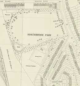 In the 1940s the sports fields at the front of the park were removed, and a separate square bowling green was added to the south of the main field on land which was originally outside the park boundaries.[3][1] Around the same time a triangular piece of land south of the new bowling green started being used for gardening allotments, as was a 2 km long stretch of land to the west of the park border following the railway line, all the way from Grove Park in the south to St. Mildred's Road to the north.[3] By the 1940s public toilets had been added to Northbrook Park off on the north side off the path[3] and a children's playground had also been constructed just off the path in the northwest corner of Northbrook Park near the greenhouses and other buildings,[3] which came to include climbing frames, swings, roundabouts, seesaws, and slides.