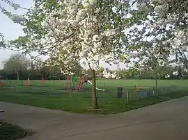Northbrook Park is a public park in Grove Park,[1][2][3] currently managed by Glendale Grounds Management for the London Borough of Lewisham.[2] It is one of Lewisham's open spaces, and is open all year from 08:00 every morning, and closes near dusk, with times ranging from 16:00 to 21:00 in the evening, depending on time of year.[4] The park is roughly 9 acres (3.6 ha) in size, approximately 220 m (241 yd) wide east to west and around 260 m (284 yd) long north to south.[3] A large central field, around 4.5 acres (1.8 ha) in size takes up roughly half the park's total area, and is around 125 m (137 yd) north to south, 190 m (208 yd) east to west[3] and is flat ground with short grass and very few trees.[5] There is a straight concrete path joining the two gated entrances on Baring Road, and a long circular concrete path that surrounds the large central field.[1][3][5] A short metal fence built to keep dogs out, follows the path and surrounds the central field, which contains a football pitch, a second smaller junior football pitch, and outdoor gym equipment.[5] An old stone sundial erected in May 1903, with engraving describing the gift of the land by Lord Northbrook to commemorate Queen Victoria's Jubilee, stands at the front of the park off the straight path,[2][3] but it is in disrepair.[5] There is a small fenced playground with slides, swings, a zip line, a splash pool, a sandpit a roundabout and climbing frames in the northeast corner just inside the circular path,[5] it was constructed around 2000, and improved in 2012. There is a thin strip of woodland surrounding the central field, including oak trees, mostly outside of the path, with fewer trees inside the path.[3][5] The northwest corner is more overgrown and contains scrubland set aside as a wildlife area,[5] this is the site of the original children's playground.[3] South of the main field is an old bowling green,[1][3][6] that is now used as a dog exercise area.[5] South of this is a triangular piece of overgrown wooded ground with dirt paths cutting through it, this area used to be allotments and was not part of the original park grounds,[3] it is now set aside as a forest school area.[5] Just off the southwest corner of the central field there is a fenced multipurpose concrete game court,[5] where a pond was previously sited.[3][7]