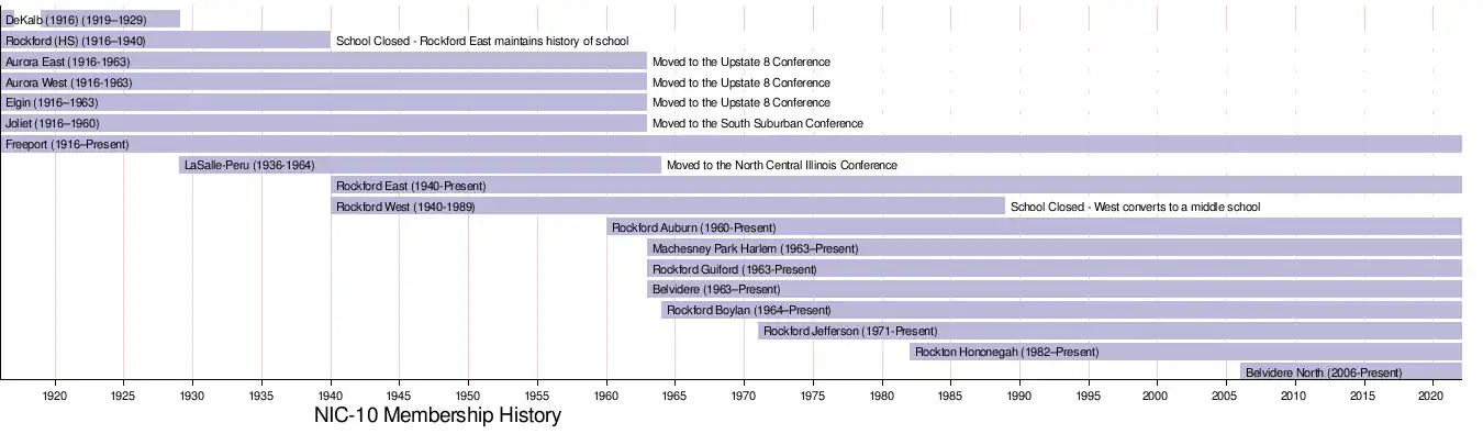 The league became the NIC-9 when Rockford West was closed after the 1988–89 school year, and reverted to NIC-10 when Belvidere North High School opened in 2007. Freeport High School remains the only original member of the conference.