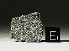 Northwest Africa 7325, also known as NWA 7325, is a unique igneous meteorite which crystallized as a basalt on a large asteroid or planetesimal approximately 4.56 billion years ago. It is classified as an ungrouped achondrite, and is notable for its green fusion crust and high-magnesium/low-iron composition.[1][2] It was purchased from anonymous finders in a marketplace in Erfoud, Morocco in April 2012.[2] The original find was composed of 35 fragments with a combined weight of approximately 345 grams (12.2 oz), however many additional fragments with a total weight of over 1,100 grams (39 oz) were subsequently recovered.[3]