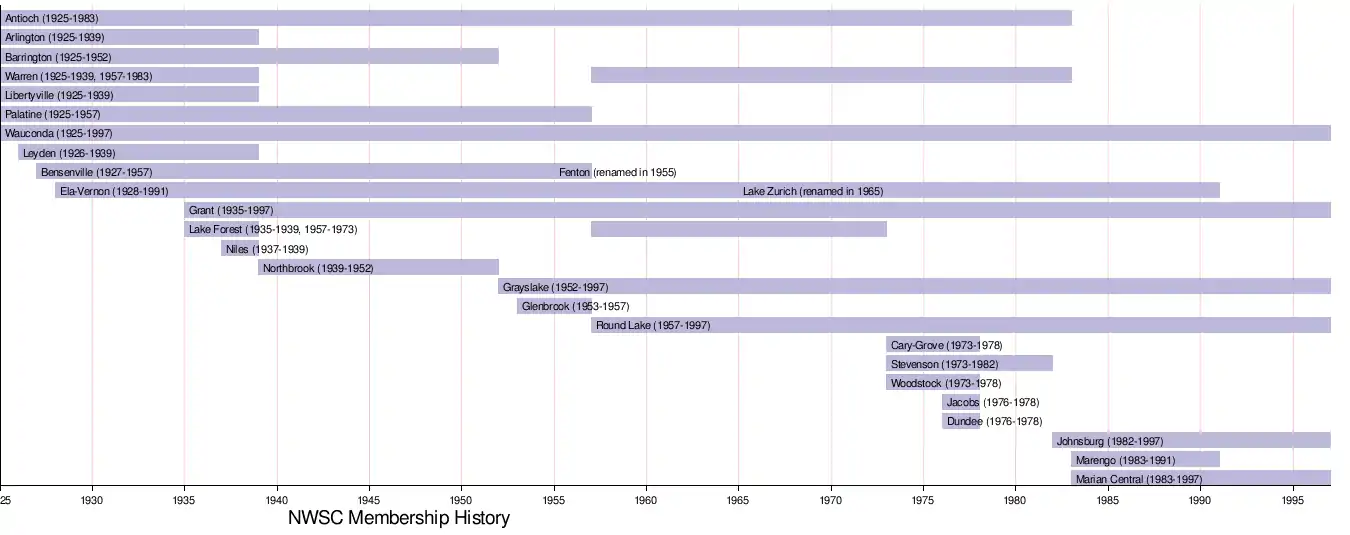 The conference housed 25 different schools in its 72-year history, with a high turnover rate of schools joining and leaving the conference. Wauconda was the only consistent member of the NWSC for its entire existence.