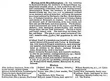 During the 19th century, today's Norton was administratively a joint township with Brockhampton as 'Norton with Brockhampton', under Bromyard, which included in 1856 at the north-east of the parish, Saltmarshe Castle, the residence of Edmund Higginson (1802-71), who had changed his name from his Barneby birth surname, was High Sheriff of Herefordshire and an art collector, and whose estate also included parts of Tedstone Delamere and Edvin Loach parishes where he sponsored the rebuilding of the parish churches. Higginson was a chief landowner of the parish, and renovated Saltmarshe Castle to a more contemporary style of architecture, with added towers and battlements, leaving part of the old castle. Saltmarshe Castle was demolished in 1955. Also directory listed is Brockhampton House, 2 miles (3 km) north-east from Bromyard, had attached a private chapel with its own curate. Norton with Brockhampton had an infant school for boys and girls. The lord of the manor was the Bishop of Hereford, Renn Hampden. The parish of 1,708 acres (691 hectares) had 'clayey and loamy' soil, on which were grown chiefly wheat, barley and beans, and had an 1851 population of 528. Occupations listed in the Norton part of the parish were nine farmers, one of which was also a builder, a carrier—transporter of trade goods, with sometimes people, between different settlements—two shopkeepers, a miller at Three Mills, a blacksmith, and a collector of rates.[4][5]