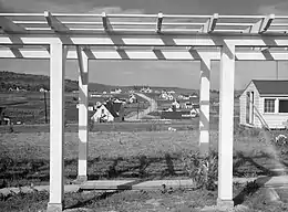 Basically the government purchased the land and people built their own homes on a lease-to-purchase agreement. Families rented their homes from the government for $12 to $14 a month, which was applied to the future purchase price of the house.[5] By 1946, all the renters had purchased their homes. These early homes had everything a family would need to survive. These amenities included a grape arbor, 3-4 acres of land to plant a garden, and chicken coops.[8] To make construction as efficient and cost-effective as possible, the division assigned crews to a single, specific construction task, such as digging the foundation or installing flooring—thus anticipating the mass building methods that would characterize large-scale residential developments such as Levittown after World War II—and applied most of workers' wages directly to the cost of their homesteads.[4] After a resident's home was built, the government then provided each family with a wheelbarrow, rake, hoe and shovel. Mounds of earth were then dumped in front of the houses, and the tenants prepared their own lawns. Families were also expected to paint their own homes. Their choices of paint were white, gray or yellow.[9] In May 1935, the first families began moving into Westmoreland Homesteads, and the task of creating a community began. Under the direction of a community manager, homesteaders established garden plots and raised livestock, including hogs and chickens. Some families produced enough to sell their surplus at a market, but for most, subsistence farming failed to meet their needs. To remedy the situation, in 1939, administrators at the Division, now under the "Rural Resettlement Administration", approved a loan for the construction of a small garment factory on site. Administered by the "Cooperative Association", a non-profit entity which also operated a cooperative store and a community health center, the garment factory by 1940 employed around 150 men and women.[4][9]