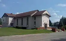 The Norwayne Community Church is located at the southeast corner of Grand Traverse Street and Dorsey Road, atop a small but prominent rise. It is a two-story T-shaped structure built from block, with a gabled roof and a small square belfry. The entrance is in the middle of the front facade under the gable, with eight steps leading to a brick porch. Tall windows line the side elevations. The church has been painted brown.[2]