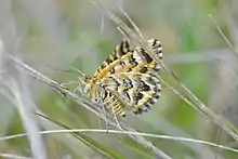 This species normally produces two broods per year but it has been hypothesised that at some localities it may produce only once in a season.[2] The female moth lays her eggs within the flower buds of their host plant.[3] When the larvae emerge from their eggs, they eat into the leaves or buds of their host, hiding from predators.[3] Once they are large enough, they emerge to feed from the fresh growth of the plant.[3] N. elegans pupate in a loose cocoon on the ground under their host.[3] The species spends approximately 43 days in their cocoon before emerging as an adult.[2] N. elegans are day flying moths.[3] They are low but fast flyers and constantly vibrate their wings to enable them to take off rapidly.[3]