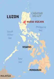 Nueva Vizcaya's at-large congressional district, also known as Nueva Vizcaya's lone district, is the sole congressional district of the Philippines in the province of Nueva Vizcaya for various national legislatures since 1898.[3] The province first elected its representative provincewide at-large for the Malolos Congress of the First Philippine Republic. In 1907, when the Philippine Assembly was established, the province had no representation as it was then classified as a special province under the supervision of the Department of the Interior Bureau of Non-Christian Tribes.[4] Since 1916 when it was re-established as a specially organized province separate from its former Comandancia de Quiañgan which became the Ifugao sub-province under Jones Law, Nueva Vizcaya has been entitled to one member in the House of Representatives.[5] It remains as a single-member district, except for a brief period between 1943 and 1944 when a second seat was allocated in the National Assembly of the Second Philippine Republic.[6]