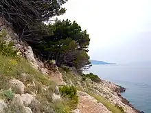 Nugal Beach is an all nude beach on the Makarska riviera in Croatia, between the towns of Makarska and Tučepi. Situated in a pebbled bay surrounded by steep cliffs, the beach is only accessible by foot following a prepared but stony path along the coast from Makarska (a 30-minute walk) or from Tučepi.
