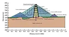 Nuozhadu Dam (Chinese: 糯扎渡大坝; pinyin: Nuòzhādù Dàbà) is an embankment dam on the Lancang (Mekong) River in Yunnan Province in southwest China. The dam is 261.5 m (858 ft) tall, and creates a reservoir with a normal capacity of 21,749,000,000 m3 (17,632,000 acre⋅ft) at a level of 812 m (2,664 ft) asl. The purpose of the dam is hydroelectric power production along with flood control and navigation. The dam supports a power station with nine generators, each with generating capacity of 650 MW. The total generating capacity of the power station is 5,850 MW.[2] Construction on the project began in 2004; the dam's first generator went online 6 September 2012 and the last generator was commissioned in June 2014.[3][4] The construction and management of the project was implemented by Huaneng Power International Ltd., which has a concession to build, own and operate hydroelectric dams on China's stretch of the Mekong River.