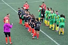 Akdeniz Nurçelik Spor (black/red) vs Osmaniye Spor (green/yellow) in the 2018-19 Turkish Women's Second Football League match. Nurcan Çelik (left in lilac/black/red) shooting a photograph of her team.