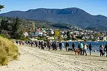 Nutgrove Beach looking toward Sandy Bay homes and kunanyi / Mount Wellington.