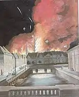 The building viewed from the Marble Bridge during the 1807 bombardment.