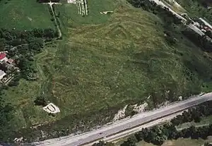 Aerial photography showing outline of Roman Castle Crumerum, Nyergesújfalu