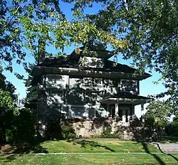 The home is a 2+12 story, American Foursquare style residential structure. Following standard Foursquare design, the house rests upon a squared, sandstone foundation and contains a basement. The Palmer House contains a large front porch with several broad pillars. Other features include bay windows, a hipped roof and dormers, and distended eaves.[3]
