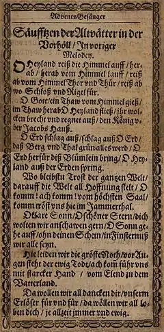 "O Heiland, reiß die Himmel auf" (O Saviour, tear open the heavens)[1] is a Christian Advent song. The text was first printed in 1622, attributed to Friedrich Spee; the melody was first printed in 1666.