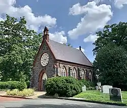 The Oak Hill Cemetery Chapel, also known as the Renwick Chapel or James Renwick Chapel,[3] is a historic building in the Georgetown neighborhood of Washington, D.C., United States. Designed by James Renwick, Jr. in 1850,[4] Oak Hill Cemetery Chapel is the architect's only known example of Gothic Revival church architecture in Washington, D.C.[5] It is located on the highest ridge in Oak Hill Cemetery, near the intersection of 29th and R Streets NW.[6] The chapel is one of two structures in Oak Hill Cemetery listed on the National Register of Historic Places, the other being the Van Ness Mausoleum. The chapel, mausoleum, and cemetery are contributing properties to the Georgetown Historic District, a National Historic Landmark.[2][1]