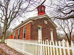 The church building is a brick structure with a tin roof and foundation of sandstone. Its primary builders, Isaac Parry and Thomas Herbert, produced a Greek Revival structure;[3] although just one story tall, it features a bell tower atop the roof. The building as a whole is a simple rectangle, although the bell tower is octagonal.[2]