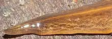 Detail of Obama nungara showing anterior end. Marginal eyes are visible as small black dots and dorsal eyes as whitish dots.