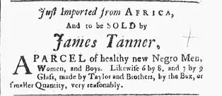 Obour Tanner was enslaved by silversmith and slave trader James Tanner, of Newport, Rhode Island some time in the early 1760s.[3] James Tanner had been dismissed from a church in Boston, and joined the First Congregational Church in Newport in 1758.[1] In that same year, Tanner advertised in the Newport Mercury for an auction of enslaved Africans "just imported from Africa."[4] Obour was baptized and admitted as "a servant of James Tanner" into the First Congregational Church in July 1768. It was common custom at this time to be baptized at the age of eighteen, so Tanner may have been born in 1750.[1] Wheatley's biographer, John Shields, suggests that perhaps Tanner and Wheatley traveled the Middle Passage together, aboard the same ship in 1761, the Phillis.[5][6]