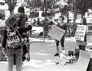 From October to December 2011, at least 110 Occupy Sacramento supporters had been arrested.[3] Some arrests occurred after people remained in César Chávez Park after park hours and after being ordered by police to leave the park.[4] Protesters had asked Sacramento's city council for permission to remain in the park after hours,[5] but were denied this access.[6] American anti-war activist Cindy Sheehan participated in Occupy Sacramento, and was arrested on the morning of October 16, 2011, along 18 other protesters for unlawful assembly.[7] Also during that time, people in the "Occupy Sacramento" group stated that one person who was involved in a hunger strike was hospitalized.[7] Occupy protesters have held marches and rallies at Sacramento's city hall in protest of being denied access to and camping at César Chávez Park after park hours.[8]