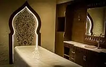 There are various themed restaurants and beverage stops in Ocean Water Park, in addition to shopping areas and a massage center. These areas offer various types of fast foods, drinks, souvenir and swimming gear and accessories shops. Also. locker rooms and bathrooms are provided.[4][5] One of the features of the water park is that it offers exclusive women-only days, suitable for Muslim tourists of the Middle East region.[6]