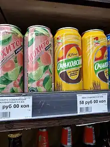 Ochakovo was originally founded in 1978 as the Московский пиво-безалкогольный комбинат (Moscow beer and non-alcoholic [beverages] plant), a state-owned company, with a view to producing beverages for participants and spectators in the upcoming 1980 Moscow Olympics. In 1993 the plant was privatised, becoming a joint-stock company.[2] While the firm maintains a respectable position within Russia, and has managed to open up foreign markets since the dissolution of the USSR, Ochakovo has slowly been losing market share in both the alcoholic and non-alcoholic beverage segments under pressure from multinational competitors such as Carlsberg, Coca-Cola and PepsiCo as well as from newer Russian firms such as Deka,[2] going from holding a 39% of the market share for kvas production in 2009[3] to 18% in 2018.[1]