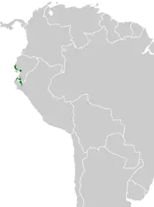 The ochre-bellied dove is found in the lowlands of western Ecuador and separately in the lowlands and Andes of southwestern Ecuador into northwestern Peru. It is a year round resident in some parts of its range but apparently makes seasonal movements in other parts. It inhabits a variety of landscapes including moist evergreen, semi-deciduous, and dry deciduous forests; lower montane forest; and humid cloudforest. In elevation it mostly ranges between 500 and 1,800 m (1,600 and 5,900 ft) but has been found as low as 80 m (260 ft) and as high as 2,625 m (8,612 ft).[4]