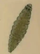 The larvae feed on Thesium species, including Thesium bavarum. They initially mine the leaves of their host plant. The mine has the form of a short, full depth, irregular, linear mine. A single larva may make several mines. Older larvae live freely on the plant under some spinning.[4] Larvae are greenish with a pale brown head.