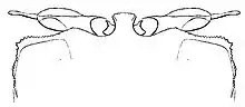 An 1882 illustration of the eyestalks and the front of the carapace of Ocypode brevicornis by Edward J. Miers[1]