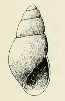 The elongate-ovate, yellowish-white shell is rather thick. It measures 6.5 mm. The nuclear whorls are small, very obliquely immersed in the first of the succeeding turns, above which the edge about two-thirds of the last nuclear whorl project. The five or six post-nuclear whorls are very high between the sutures, moderately rounded, marked by lines of growth and fine, irregular and irregularly distributed incised spiral lines. The sutures are well impressed. The periphery and the base of the body whorl are well rounded, marked like the space between the sutures. The aperture is ear-shaped. The posterior angle is acute. The outer lip is rather thick within but thin at the edge. The columella is stout, curved, reflected, reinforced by the base and provided with a strong oblique fold at its insertion. The parietal wall is covered by a thin callus.[4]