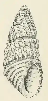 The white shell has a very elongate-ovate shape. Its length measures 4.1 mm. The small whorls of the protoconch are deeply obliquely immersed in the first of the succeeding turns. The six whorls of the teleoconch are moderately rounded, considerably contracted at the sutures and moderately shouldered at the summit. They are marked by strongly nodulous, decidedly retractive axial ribs, of which 14 occur upon the first, 16 upon the second to fourth, and 22 upon the penultimate turn. In addition to the axial ribs the whorls are marked between the sutures by four spiral keels which are a little less strong than the ribs and render them nodulous at their junction. The spaces enclosed between the ribs and spiral cords are oblong oval pits on all the whorls but the last on which they are round. The sutures are subchanneled. The periphery of the body whorl is marked by a strong broad groove. It is curved by the axial ribs which extend to the posterior border of the first basal cord. The base of the body whorl is well rounded. It is marked by six strong rounded, spiral cords which are a little weaker at the umbilical area than at the periphery. The spaces separating the spiral cords of the base are about as wide as the cords and are covered by numerous slender axial threads. The aperture is oval. The posterior angle is obtuse. The outer lip is thin, showing the external sculpture within. The columella is slender, curved, and provided with a strong fold at its insertion. The parietal wall is covered with a thin callus.[4]