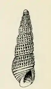 The bluish-white shell has a very elongate conic shape. Its length measures 3.3 mm. The two whorls of the protoconch are smooth, forming a depressed helicoid spire, whose axis is at right angles to that of the succeeding turns, in the first of which it is about half immersed. The eight whorls of the teleoconch are moderately rounded, slightly shouldered at the summit, somewhat contracted at the sutures. They are marked by four strong spiral cords and axial ribs, which are a little less strong than the cords; 18 of the ribs occur upon the first, 16 upon the second to fifth, 20 upon the sixth, and 34 upon the penultimate turn. The junctions of the ribs and spiral cords form moderately strong tubercles, while the spaces enclosed between them appear as almost circular, well-impressed pits. The periphery of the body whorl is marked by a spiral keel a little less strong than those between the sutures. The base of the shell is well rounded, somewhat attenuated anteriorly. It is marked by five almost equal and equally spaced spiral cords and two very slender lirations, the latter near the columella. The deep grooves between the spiral cords are marked by numerous slender axial lirations. The sutures are subchanneled. The aperture is irregular, somewhat channeled anteriorly. The posterior angle is obtuse. The outer lip is thin, rendered sinuous by the spiral cords. The columella is slender, sigmoid, reinforced by the base, and provided with a strong, deep-seated fold at its insertion. The parietal wall is covered with a faint callus.[4]